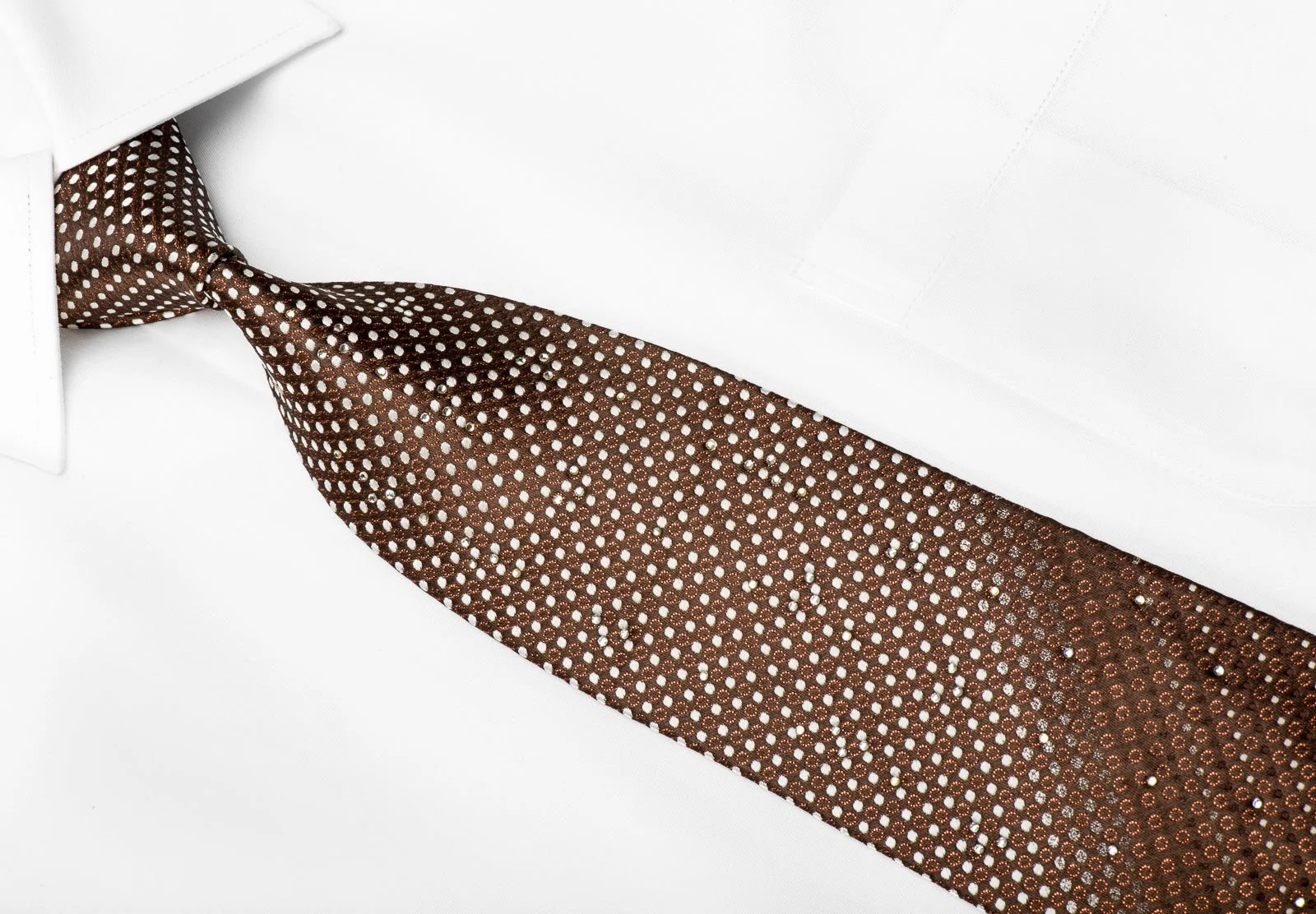 Stylish men's crystal silk necktie perfect on every occasion handmade and designed by top brand name Austin Reed. Presenting an elegant silver Dots design on woven brown silk with crystal Rhinestones and brown metallic sparkles.
