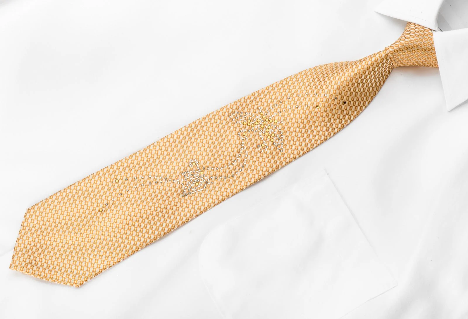 Avolio Men's Silk Necktie Crystal Rhinestone Butterflies On Peach Orange Checker With Sparkles