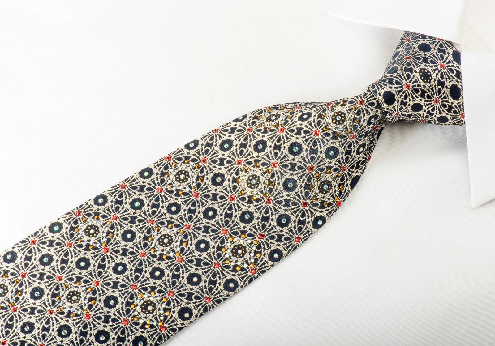 This exquisite men's necktie is crafted by hand using premium silk. It features a refined silver Arabesque pattern set against a woven navy blue silk background, adorned with shimmering red, white, and orange rhinestones complemented by gold sparkles.
