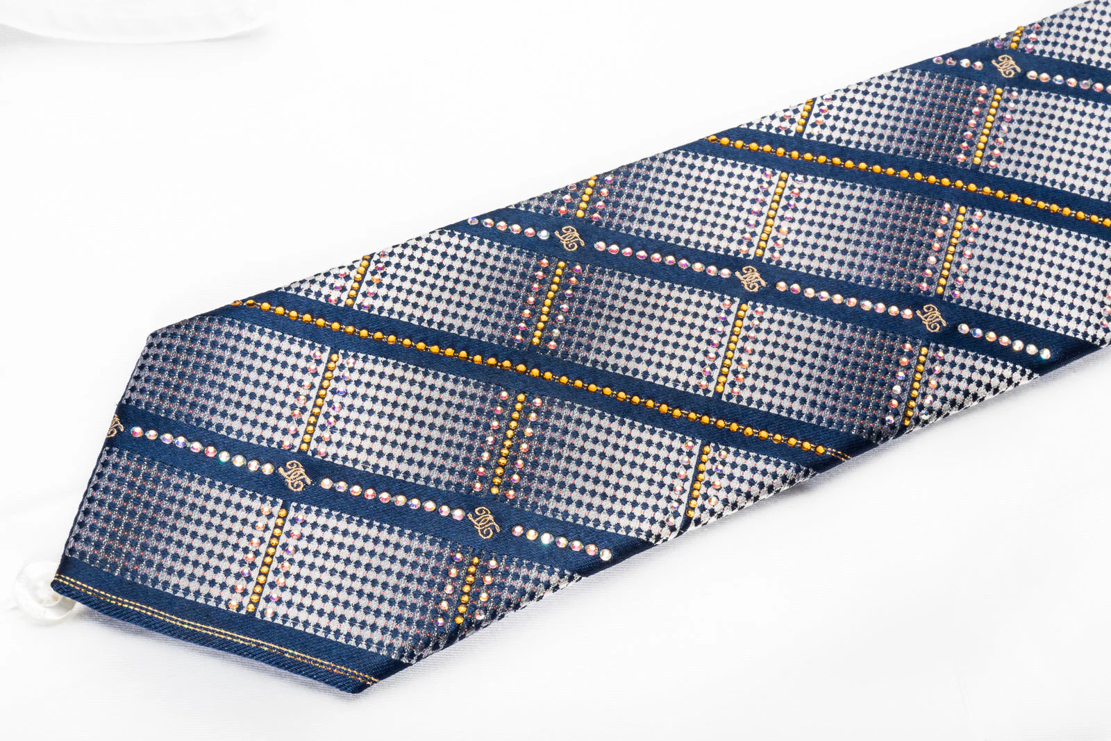 This exquisite rhinestone necktie is crafted from premium silk, featuring a chic striped pattern on teal blue fabric. It shines beautifully with golden and white rhinestones accented by red and gold sparkles, adding a touch of elegance to your outfit.