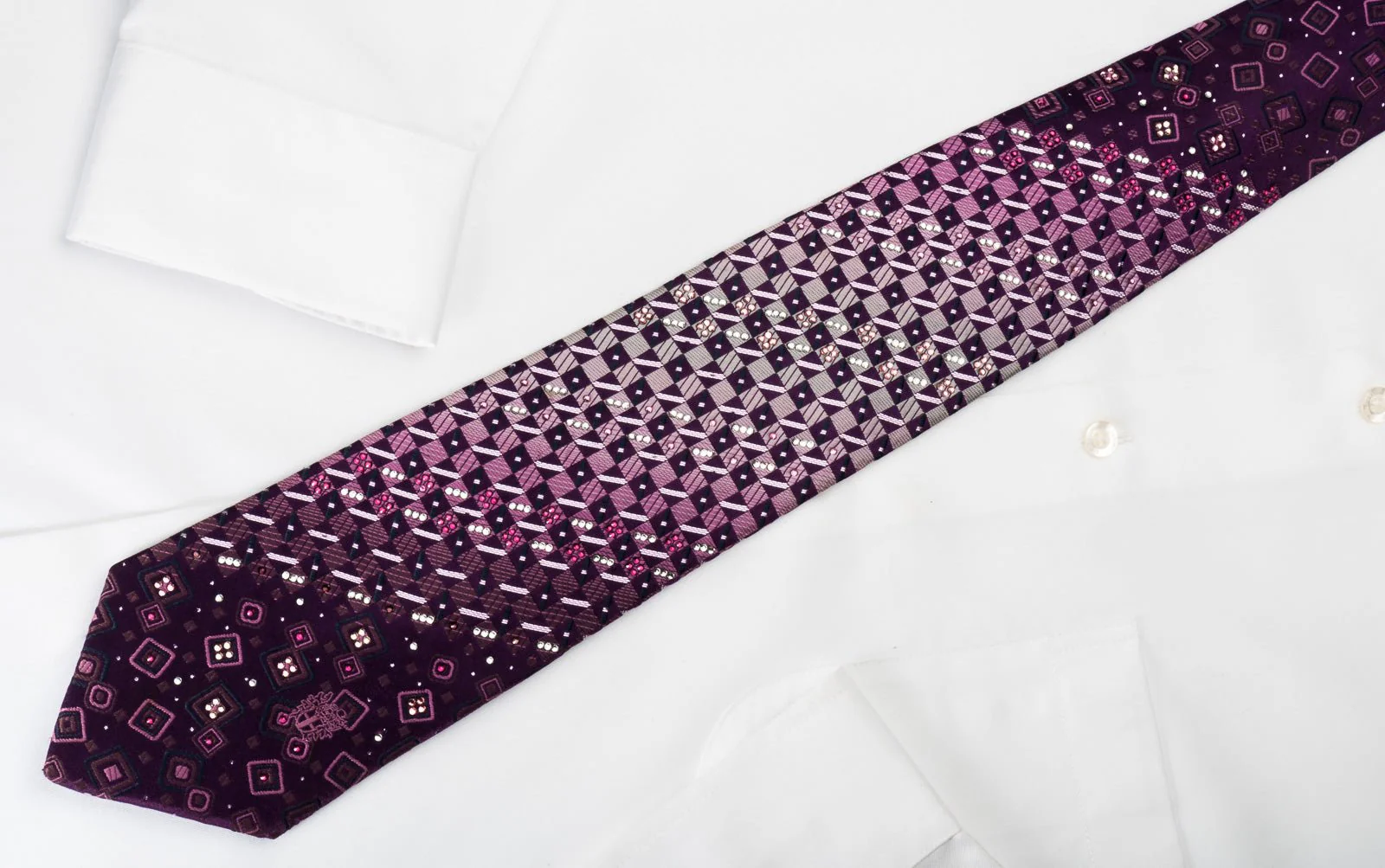 Daks Silk Rhinestone Necktie Checker On Purple With Silver Sparkles