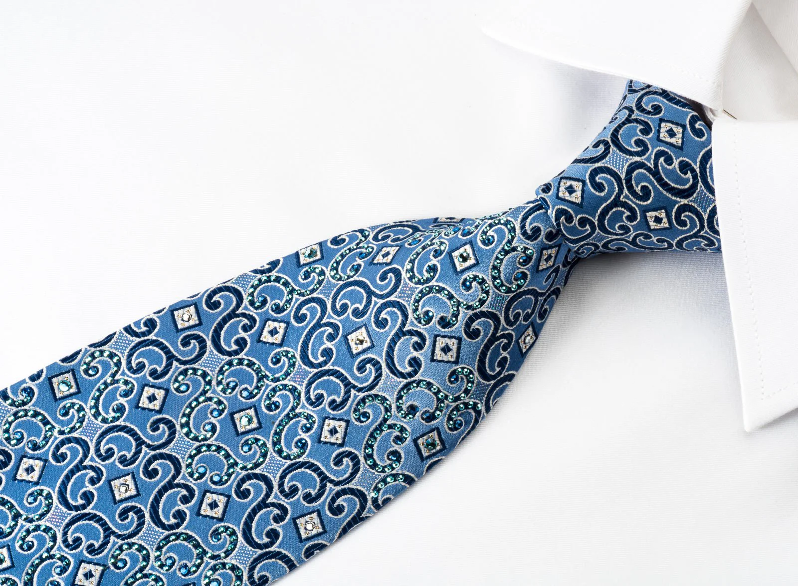 This stunning men's necktie features a stylish scroll pattern on blue woven silk, adorned with sparkling white and blue crystal rhinestones and silver accents for an elegant finish.