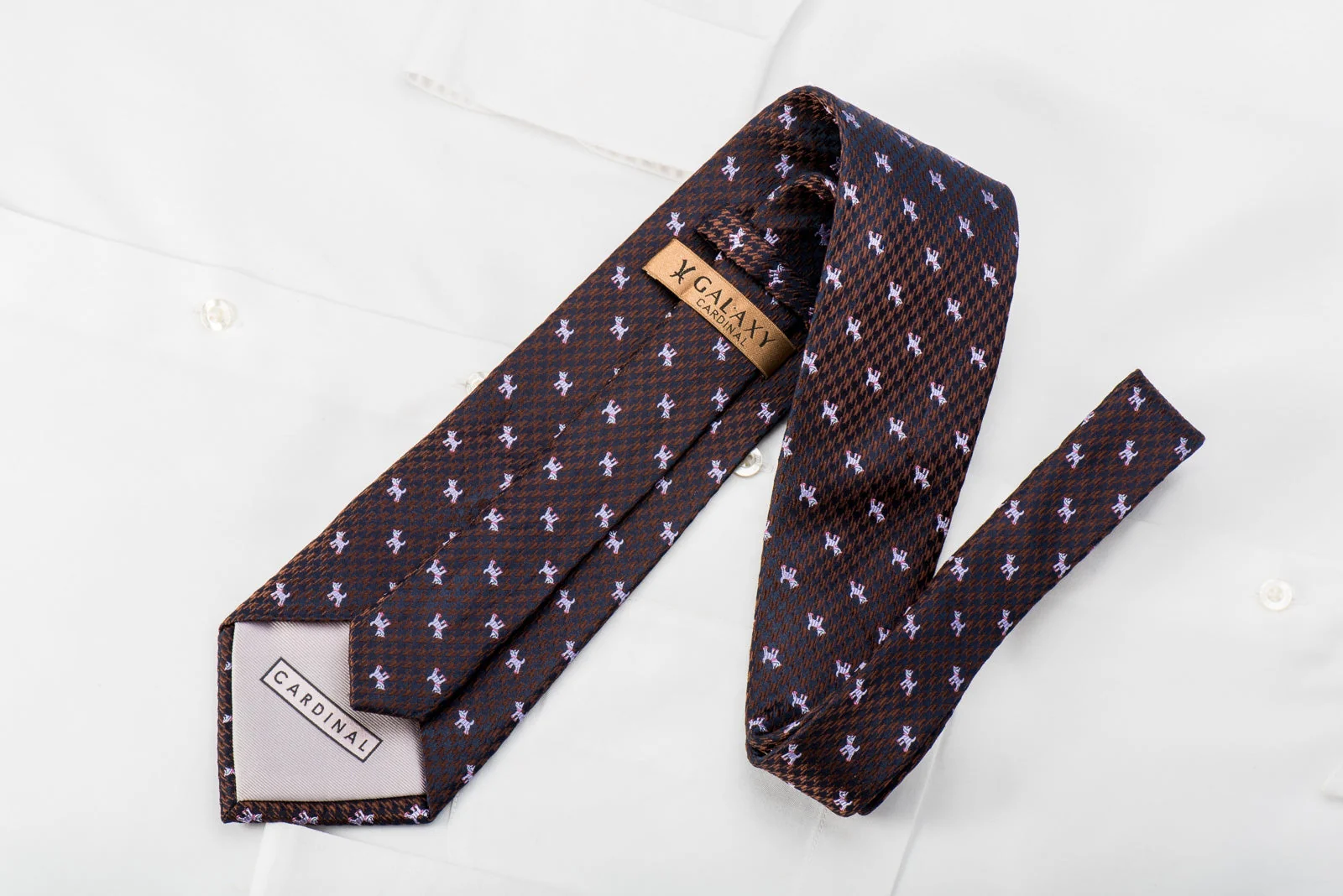 Beautiful men's necktie handmade from the finest quality silk and designed by top brand name Galaxy. Presenting a wonderful Dog design on brown, navy Hounds Tooth Jacquard woven silk.