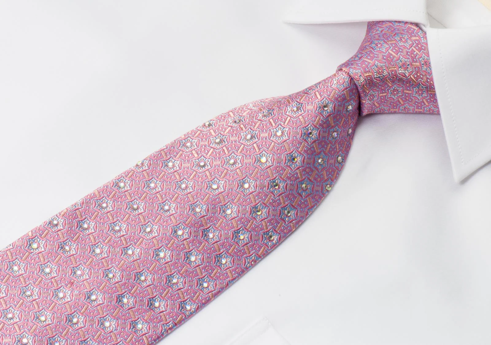 Gorgeous hand made men's woven silk Rhinestone necktie designed by Giorgio Ferri, presenting a wonderful geometric Trellis design on mauve silk and sparkling with large clear crystal Rhinestones.