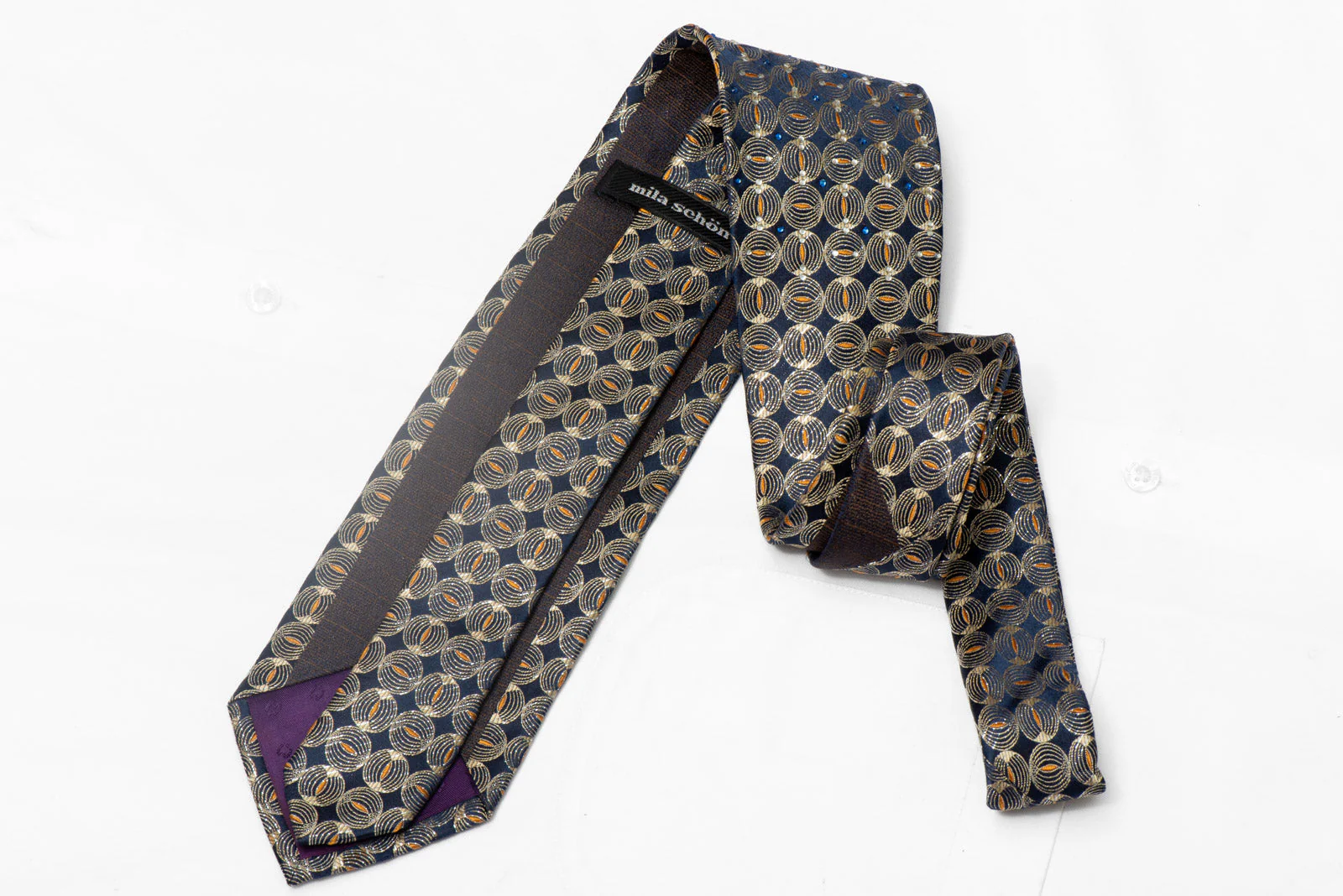 Gold Geometric On Navy Rhinestone Silk Necktie With Silver Sparkles—