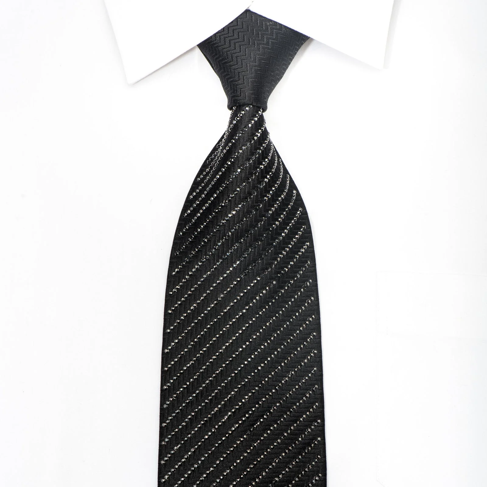 Elevate formal attire with this exceptional woven silk necktie, where understated luxury meets refined sparkle. Crafted by Lalanta, this piece features over 2,000 meticulously applied black rhinestones arranged in elegant diagonal stripes across a rich black silk canvas, creating subtle dimension that catches light with every movement.