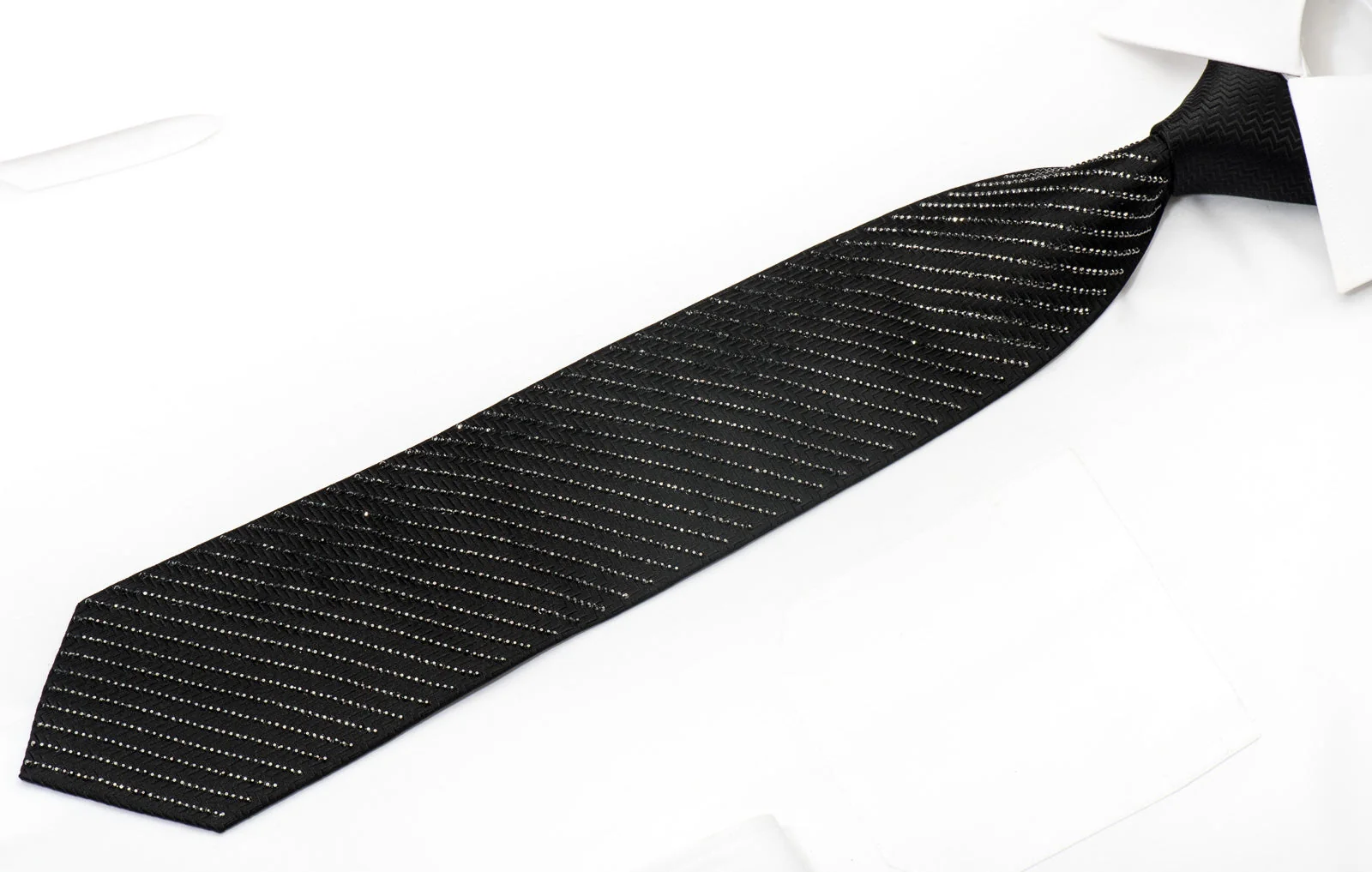 Crafted from premium silk with a textured herringbone reverse, the tie balances visual drama with wearability. Each rhinestone is individually set to maintain the fabric's natural drape and knot formation. The result is a statement piece that photographs beautifully yet remains appropriate for conservative dress codes.