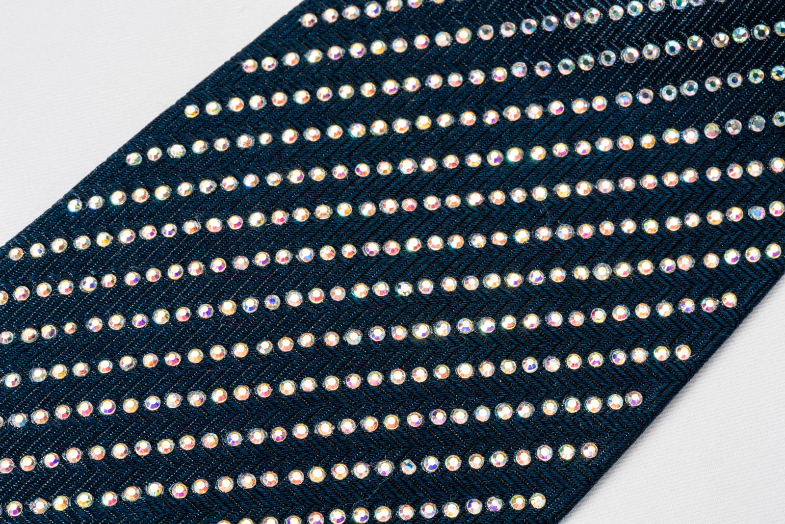 Stand out in a crowd wearing this gorgeous woven silk necktie designed and hand made by San-Dee. Presenting a dazzling design absolutely sparkling with hundreds of striped Korean crystal Rhinestones on beautiful dark blue herringbone woven silk.