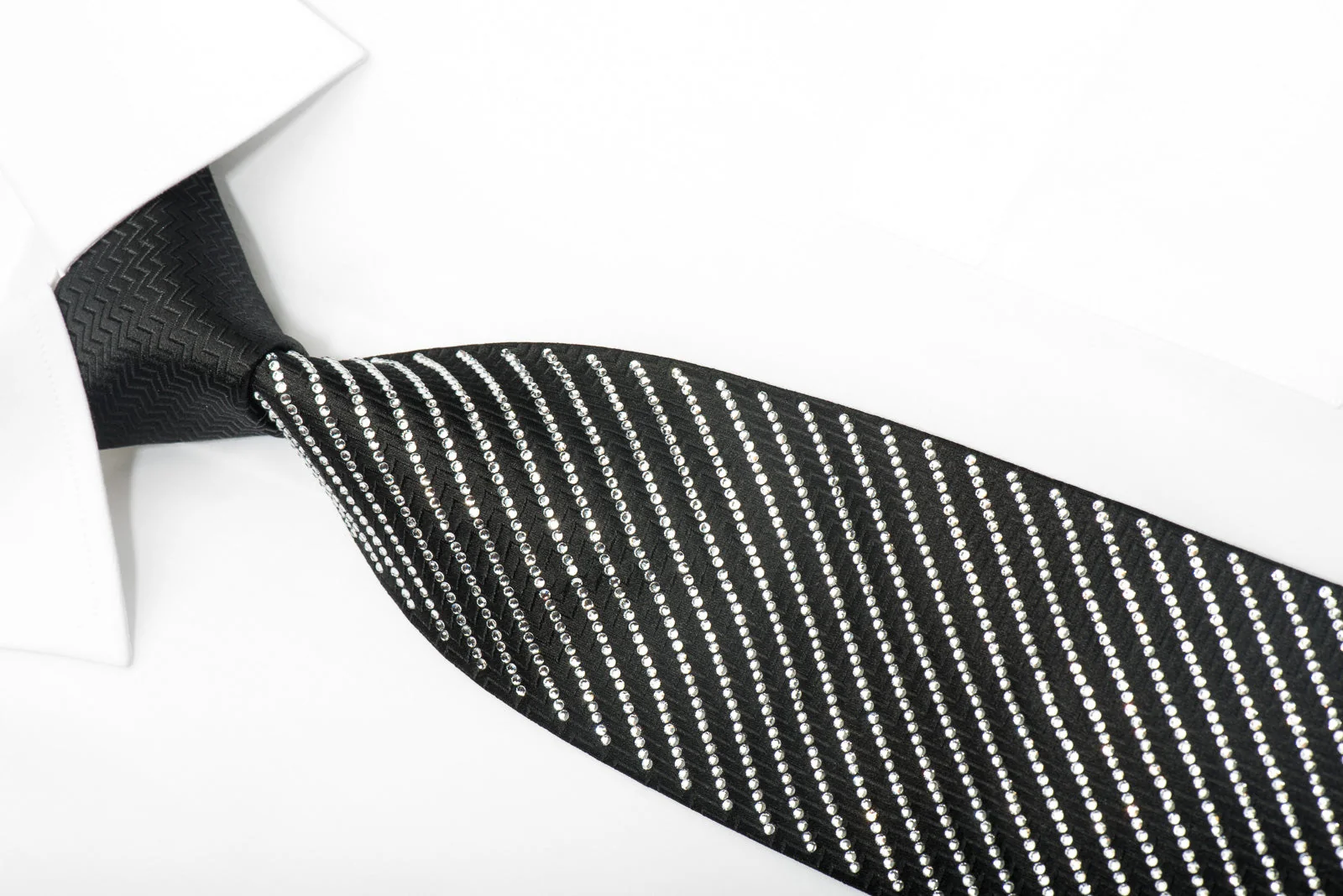 Make a striking impression with this elegant men's necktie, meticulously handcrafted from woven silk by Lalanta. Featuring a dazzling arrangement of more than 2200 clear crystal rhinestones, this black silk tie offers a sparkling striped pattern that adds a refined touch to your outfit.