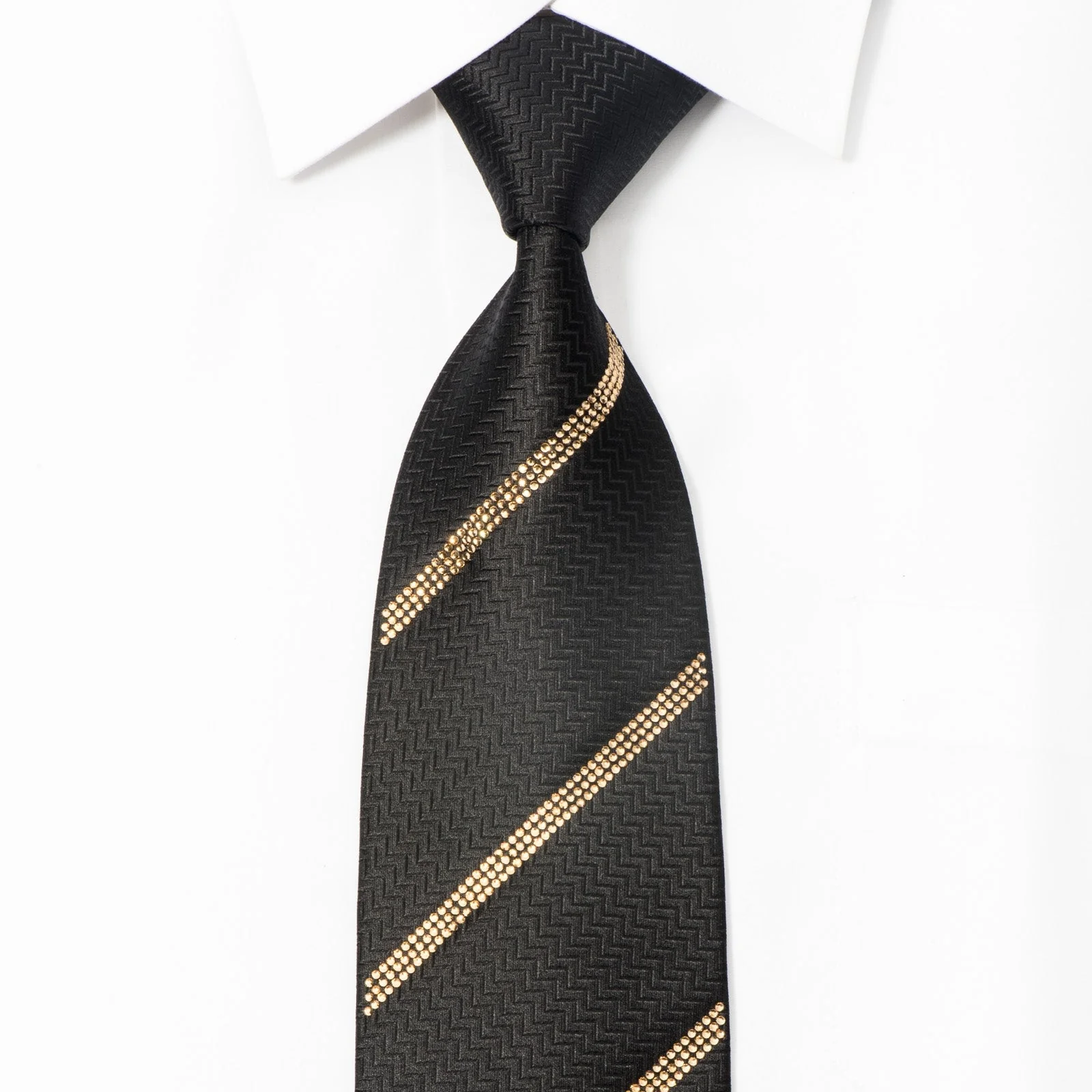 Beautiful men's Rhinestone necktie handmade from the finest quality silk and designed by Lalanta. Presenting an elegant design with clear gold stripped crystal Rhinestones on black Herringbone woven silk.