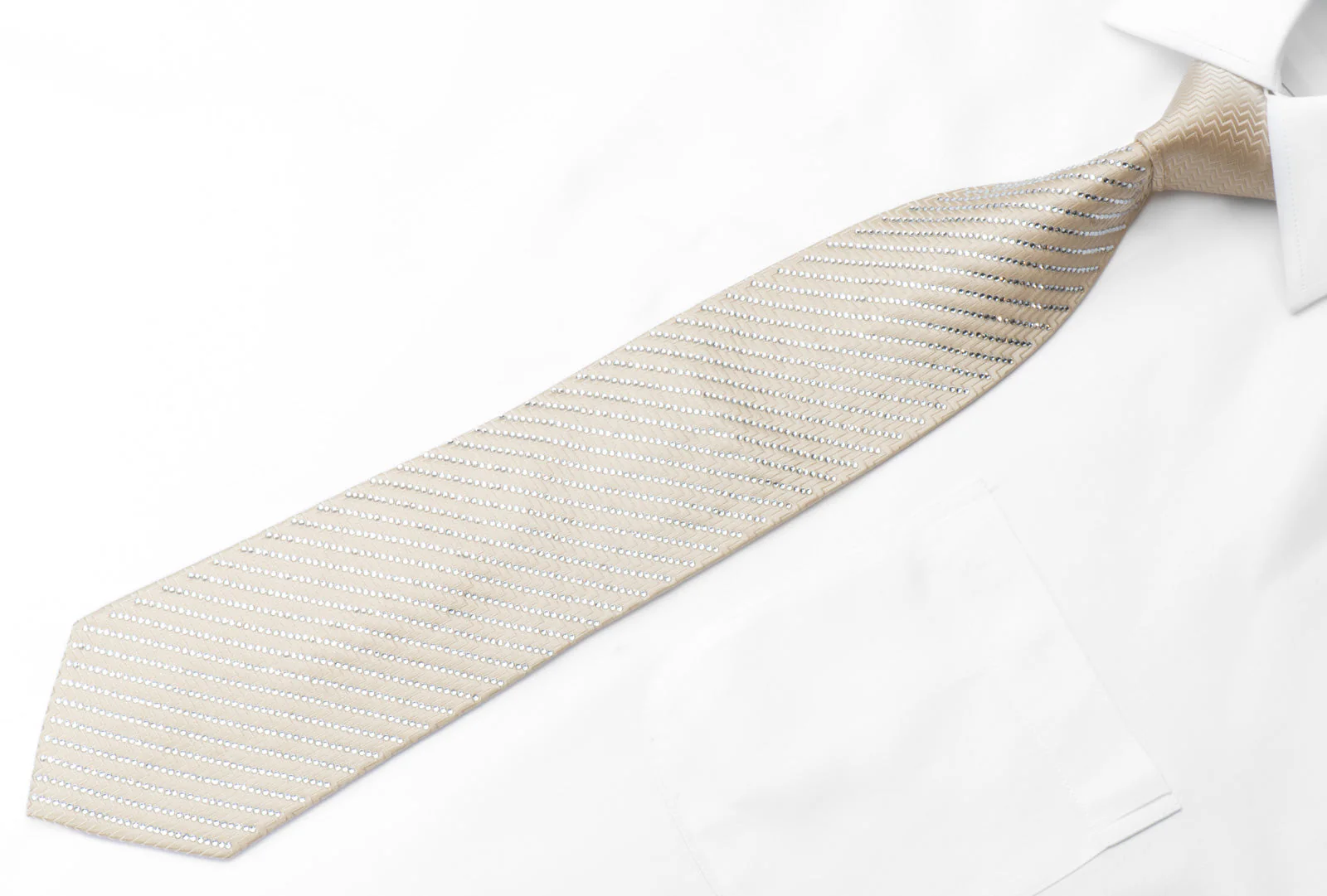 Men's Straas Diamante Silk Necktie Striped Sparkling Crystal Rhinestone On Ivory Cream