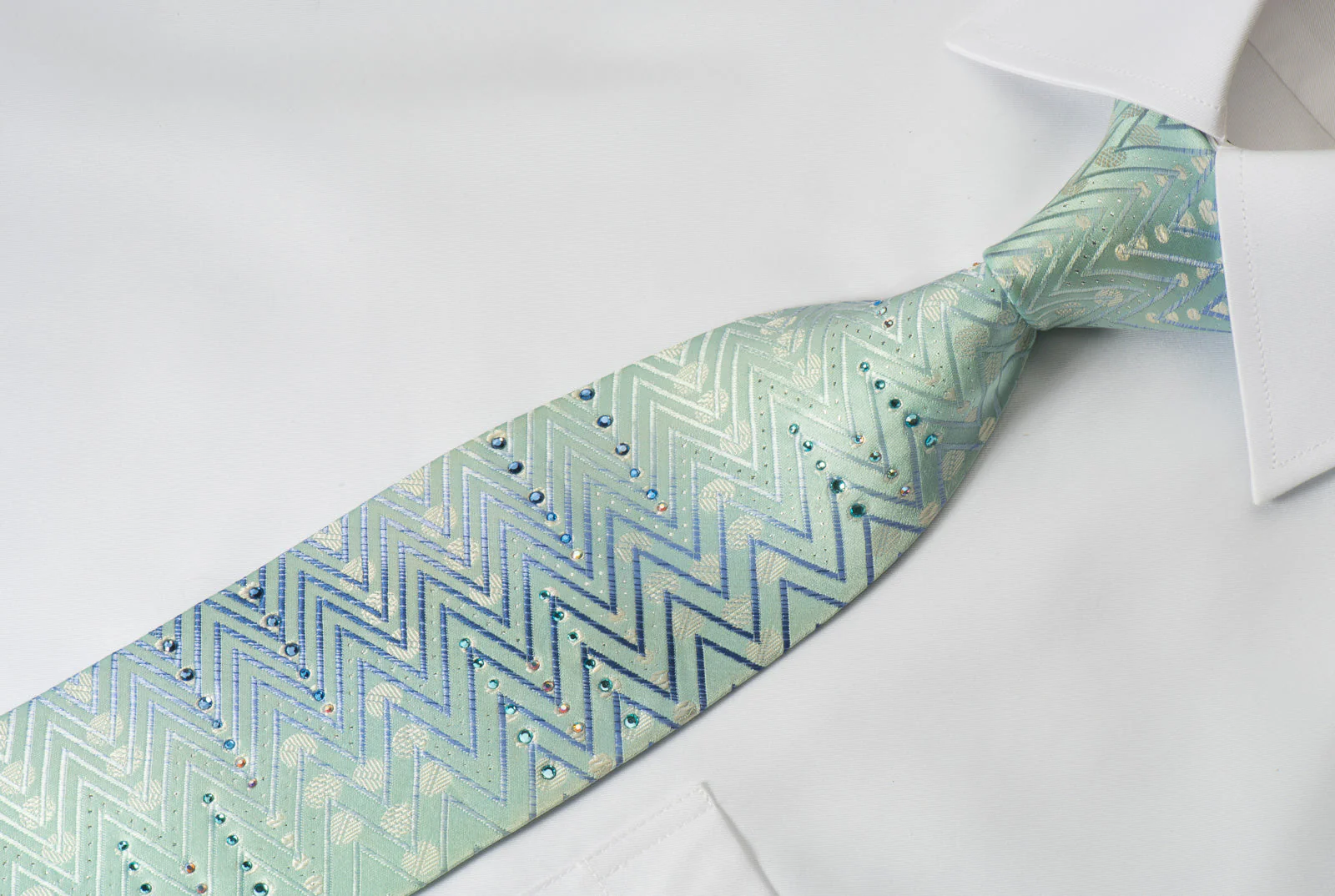 Perfect for any formal occasion wearing this beautiful handmade men's woven silk Rhinestone necktie designed by top brand name Paco Rabanne, presenting a gorgeous zigzag striped design on pale blue silk, sparkling with clear white, blue crystal Rhinestones and silver sparkles.