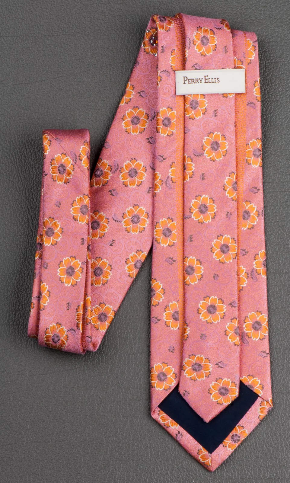 Perry Ellis Men's Rhinestone Silk Neck Tie Orange Floral Design On Salmon Pink