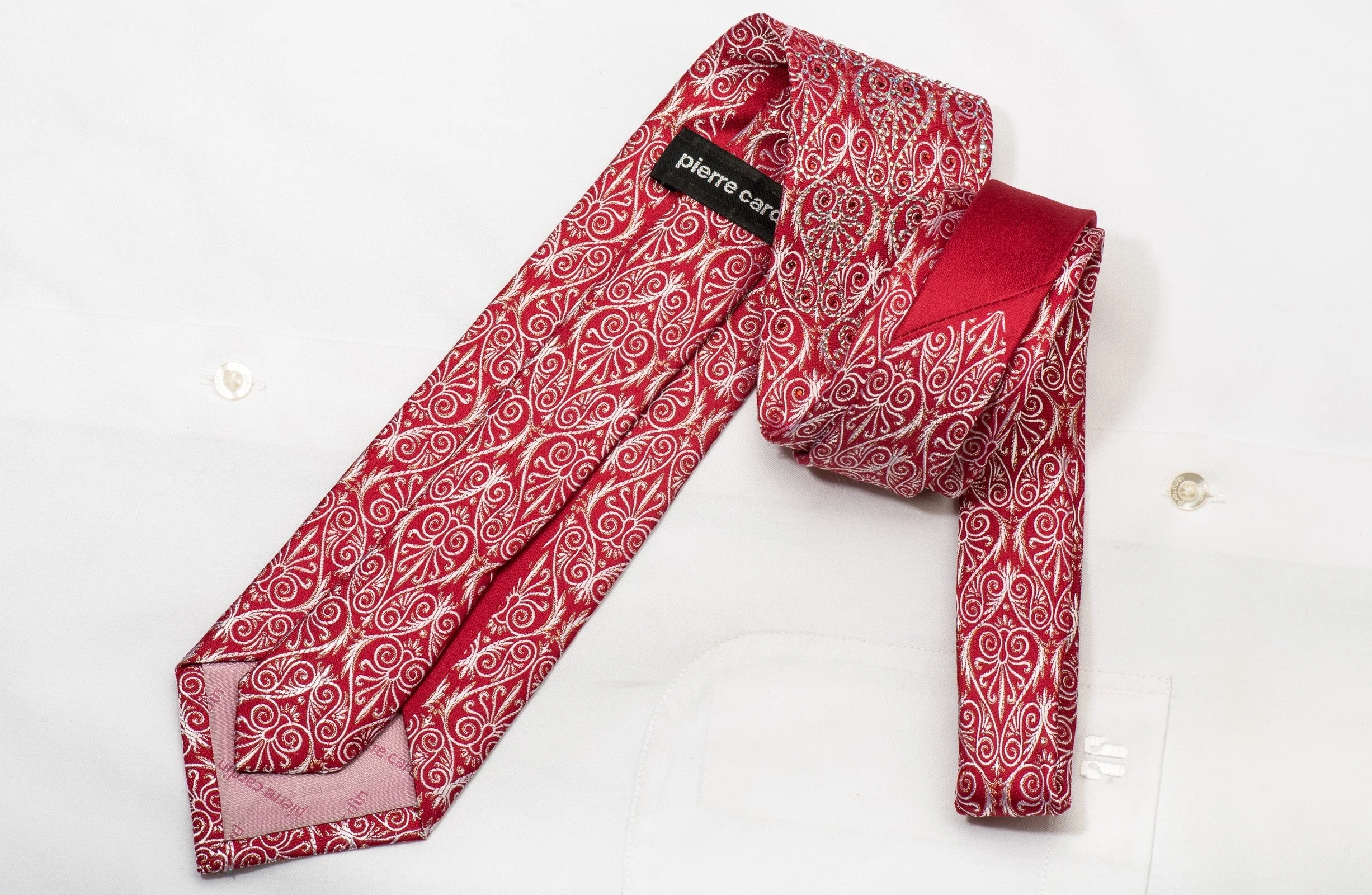 This elegant men's necktie is made from premium silk and showcases a beautiful silver Anthemion design on a rich red background. Adorned with shimmering white and red crystal rhinestones, it adds a touch of refined sparkle you’ll truly appreciate.