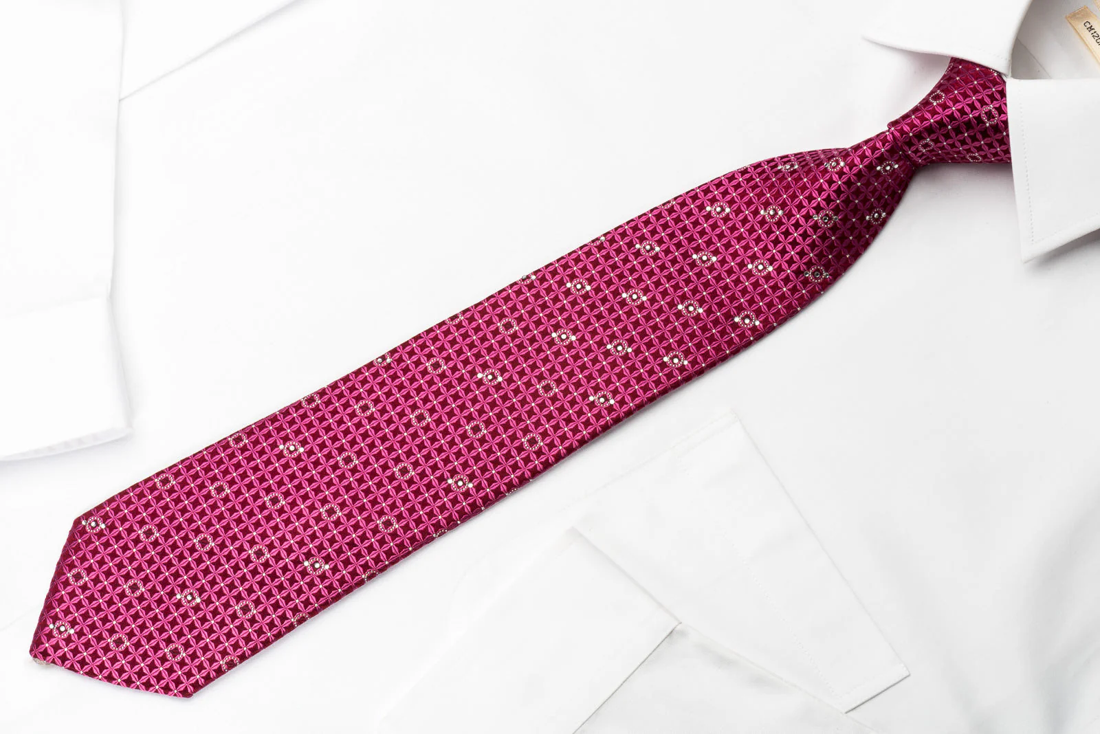 Stand out in a crowd wearing this gorgeous handmade men's woven silk Rhinestone necktie designed by top brand name Pierre Cardin. Presenting a stylish Trellis design on purple silk and sparkling with clear white crystal Rhinestones and silver sparkles.