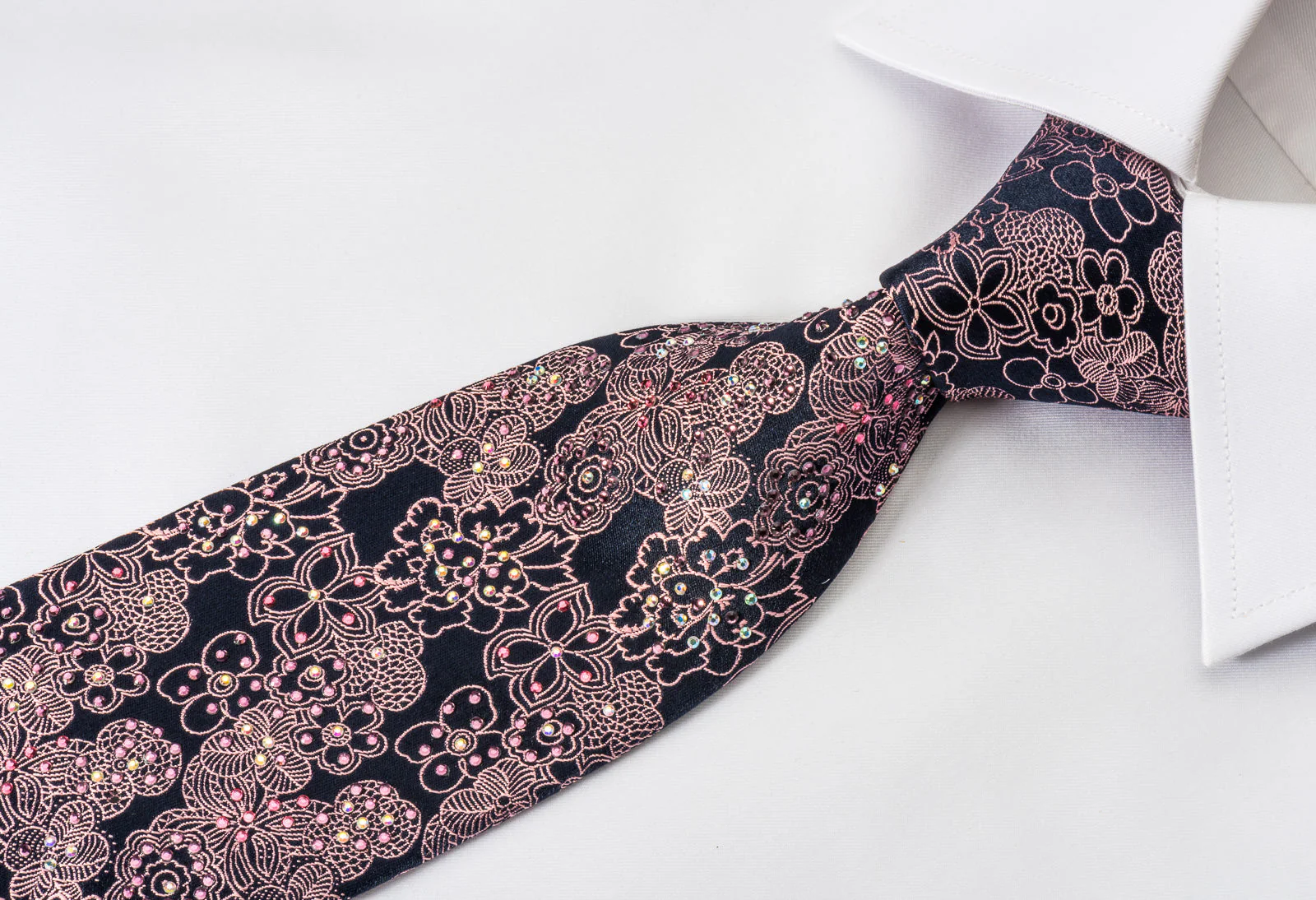 Gorgeous handmade men's woven silk Rhinestone necktie. Presenting a stylish purple floral design on navy blue silk. Sparkling with clear purple crystal Rhinestones.