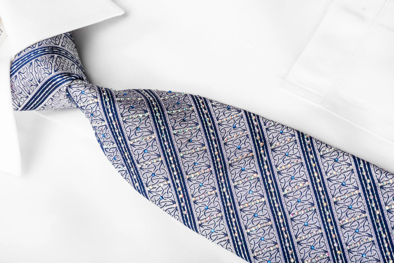 Blue Stripes On Silver With Silver Sparkles Rhinestone Silk Necktie