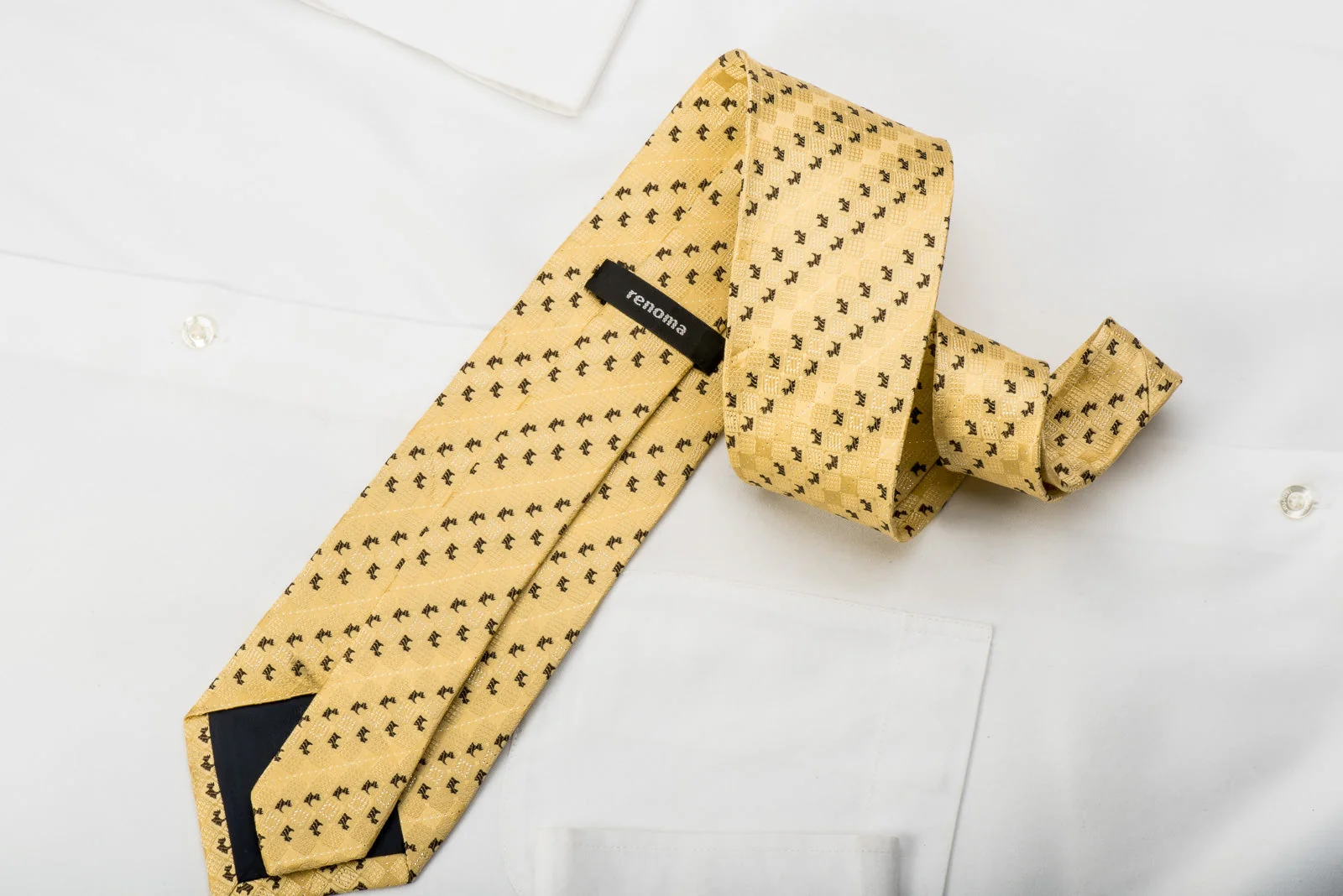 Men's silk necktie perfect for every occasion handmade from the finest quality silk and designed by top brand name Renoma. Presenting an elegant design with brown Scottie dogs on woven yellow silk with silver sparkles.