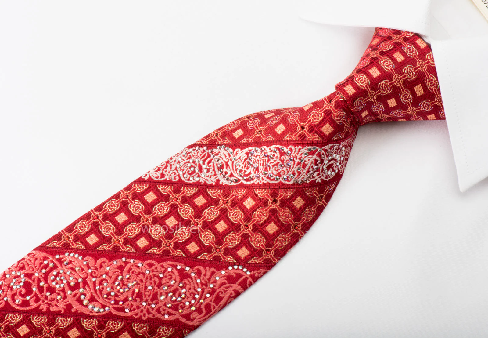 This exquisite necktie is crafted by hand from premium woven silk, featuring an elegant Trellis pattern on a vibrant red background. It shines beautifully with white and red rhinestones complemented by silver sparkles, adding a touch of refined glamour to your outfit.