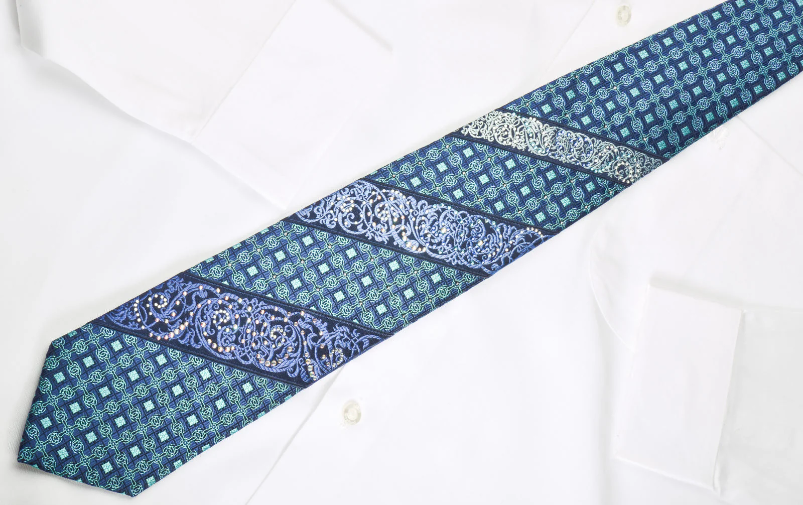 Turquoise Lattice Filigree On Blue Silk Tie With Rhinestones