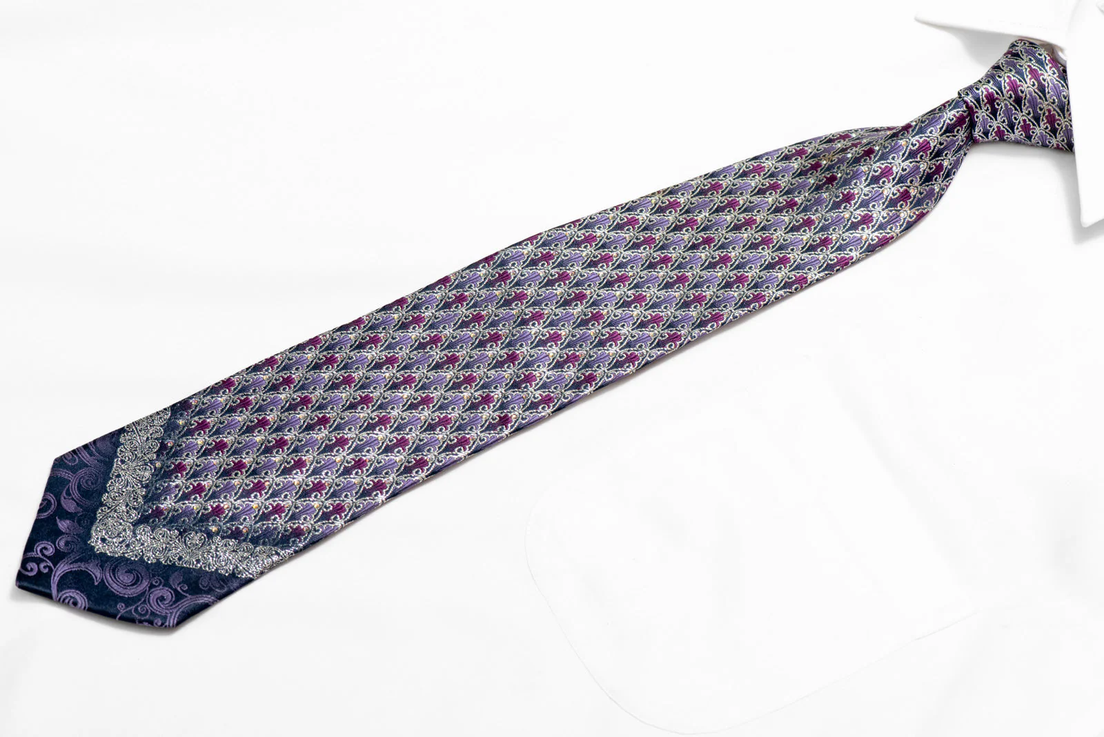 Luminous Rhinestone Silk Necktie – Purple & Silver Art Deco Pattern