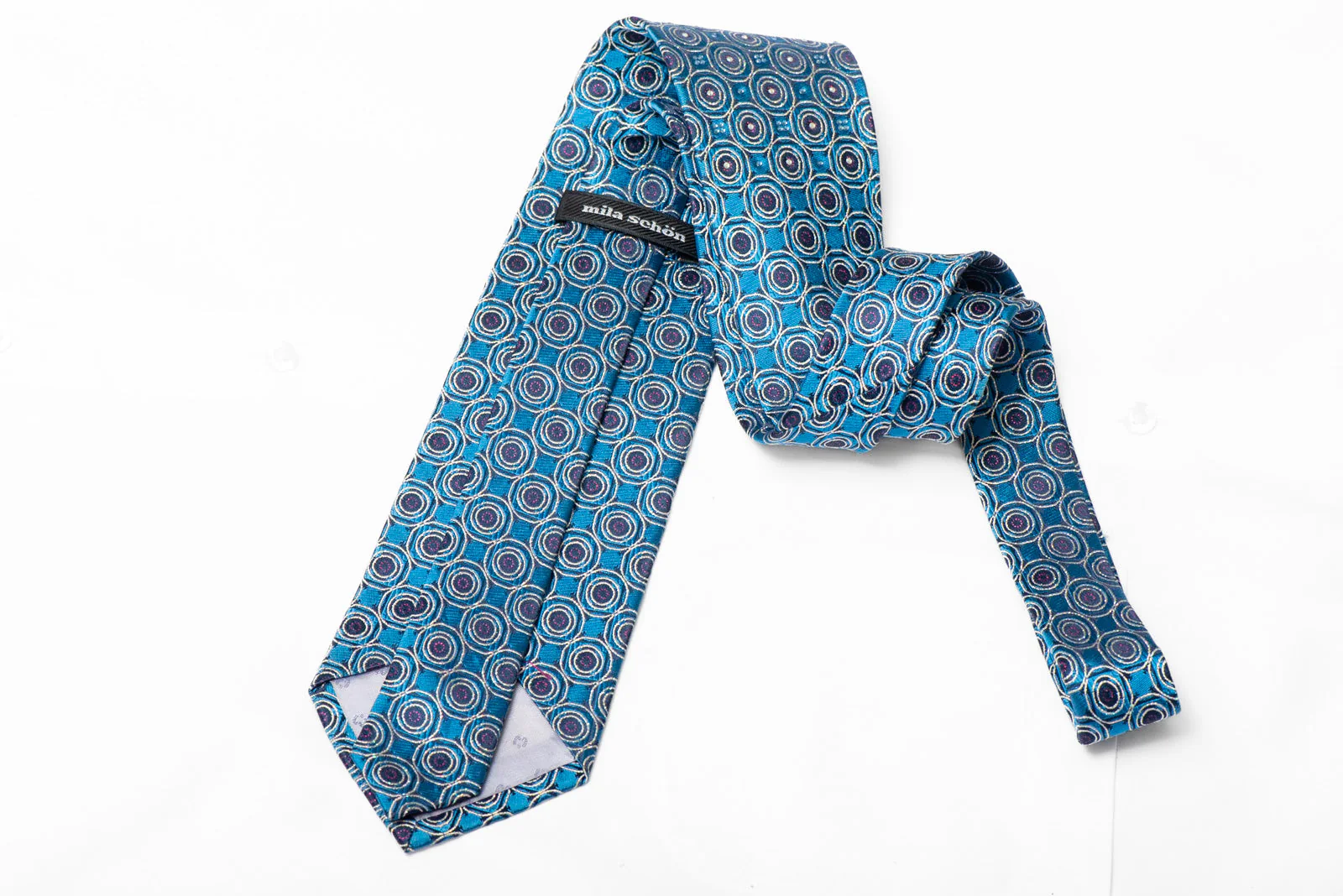 Silver Teal Geometric On Navy Rhinestone Silk Necktie With Silver Sparkles